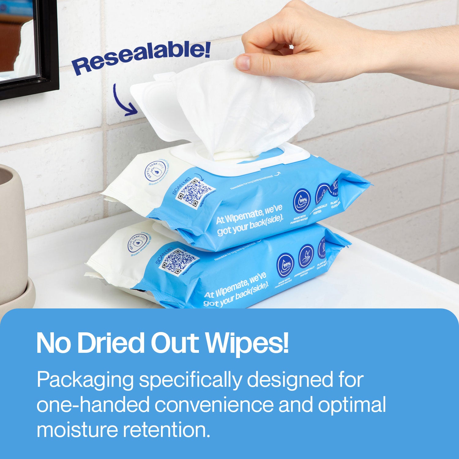 Our wipes are made with 99% purified water, ensuring a soft and refreshing clean that's kind to your skin and the environment. Infused with soothing aloe and nourishing vitamin E, Wipemate wipes provide moisturizing comfort while gently removing residue and odor. Dermatologist tested and approved, these wipes are suitable for even the most sensitive skin types. Experience the difference of a truly clean, fresh feeling with Wipemate Flushable Wipes.