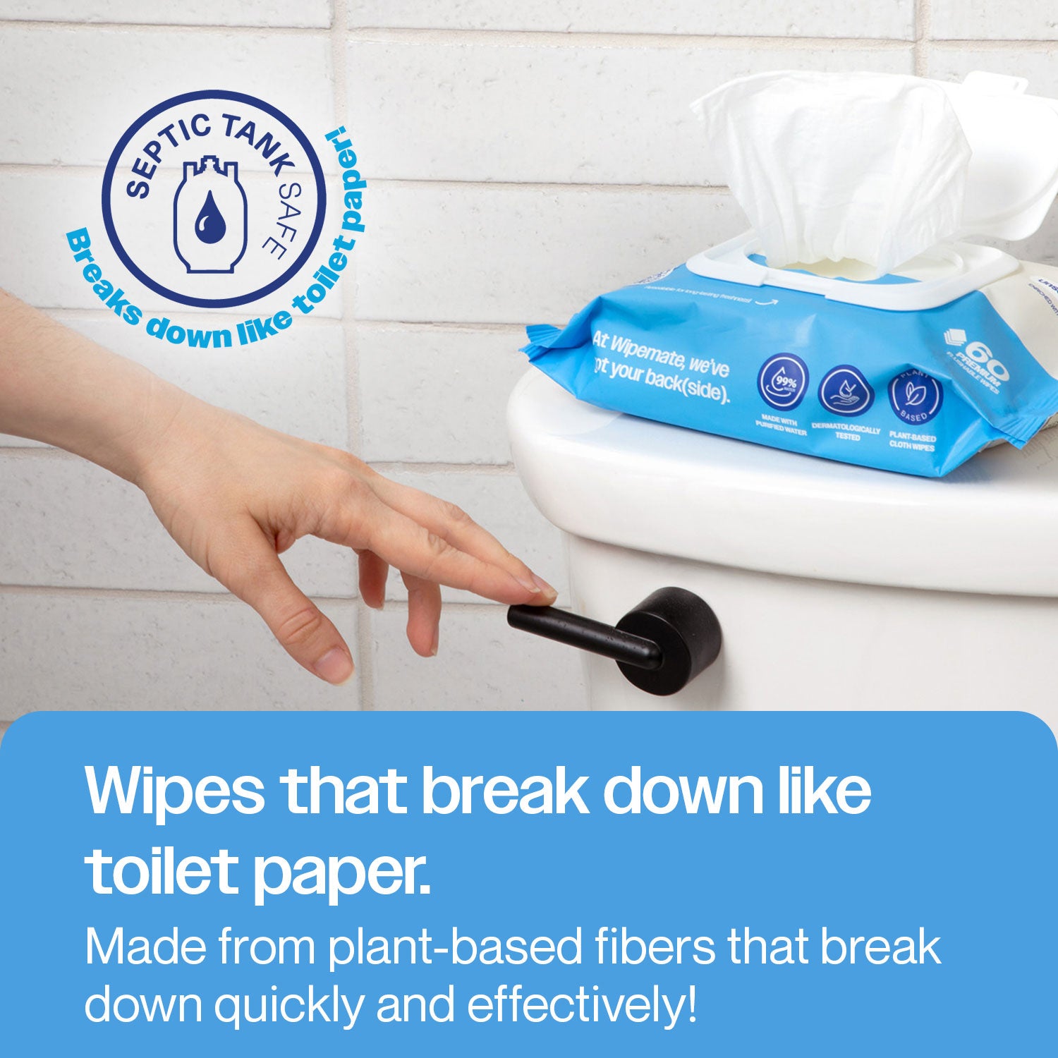 Wipemate Flushable Wipes are Made from renewable plant-based fibers, our wipes break down just like toilet paper after flushing. Thoroughly tested and certified as septic-safe, Wipemate wipes are designed to disperse quickly in water, ensuring a clog-free and worry-free experience for your home's plumbing system.